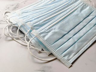 Ein Stapel medizinischer Atemschutzmasken liegt auf einem hellen Untergrund.